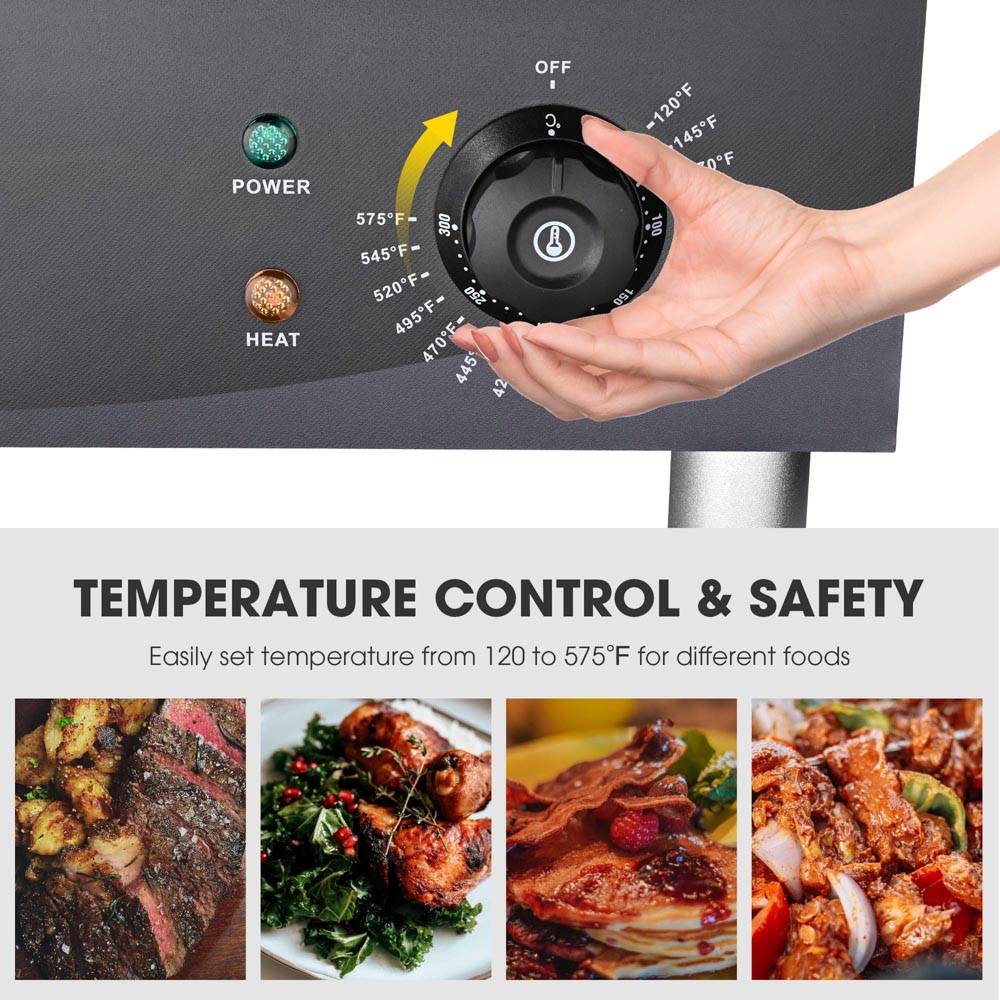 - Adjustable temp. control from 120°F to 575°F and a heat alert light to keep you informed about different foods