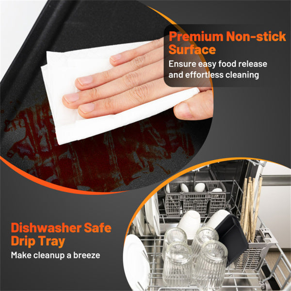 The center grooves direct excess oil to a removable drip tray, helping reduce fat content and mess. When you're done cooking, simply remove the tray and toss it in the dishwasher.