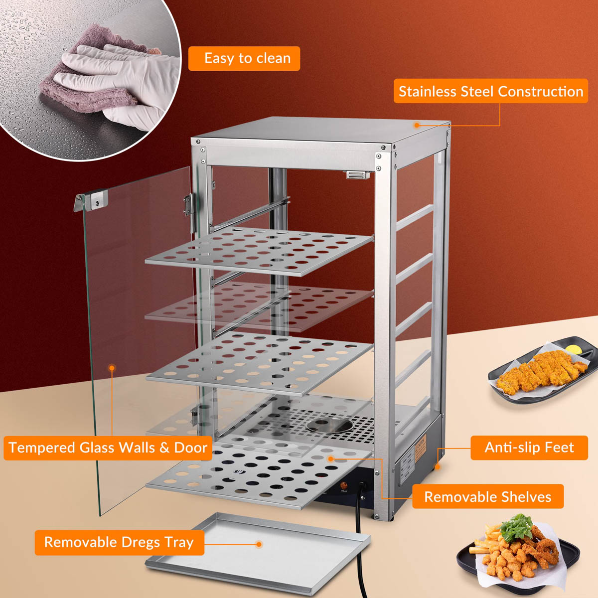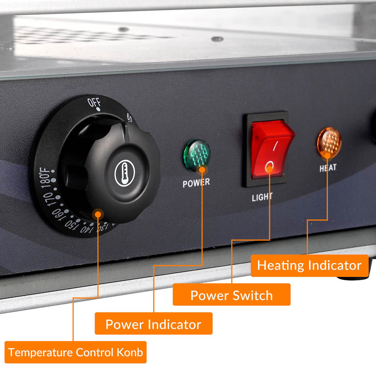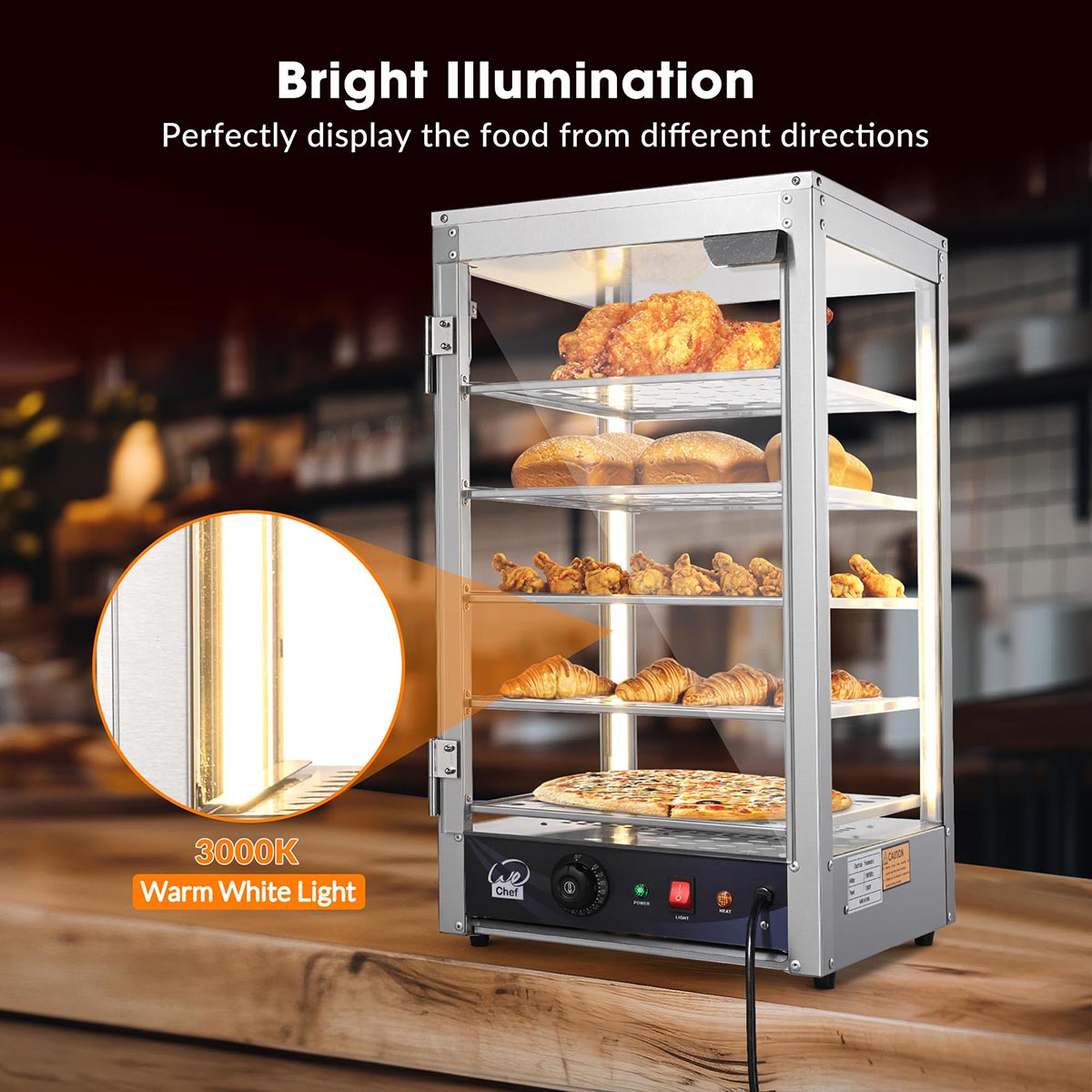 600W 5-Tier Commercial Food Warmer with a size of 15"x15"x28" provides ample space for food on each shelf. With LED light on the side rack, your food will look even more appetizing. The temperature can be adjusted from 60 to 185 degrees Fahrenheit, making it perfect for warming pizzas, burgers, chicken, etc.